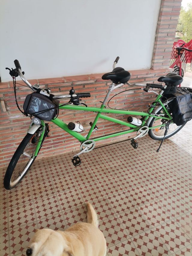 Bicicleta tándem de color verde, ideal para paseos en pareja o con amigos. - Dos sillines. - Manillar delantero y trasero. - Portabultos trasero.