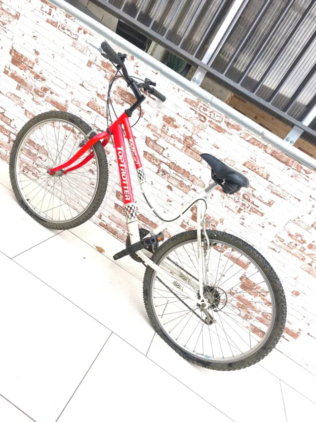 Bicicleta de montaña con un diseño llamativo en rojo y blanco. - Cuadro de color rojo y blanco. - Ruedas de 26 pulgadas. - Sillín negro. - Manillar negro.