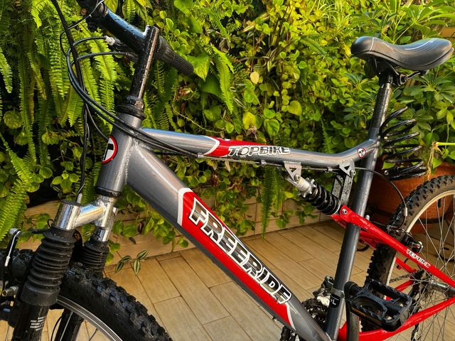 Detalles del productoSe vende bicicleta de montaña TOPBIKE FREERIDE (Doble Suspensión) con ruedas de 26 pulgadas. Ideal para piezas, para alguien manitas, o para iniciación una vez reparada.