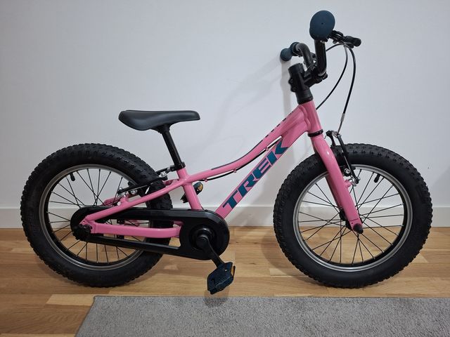 Bicicleta infantil marca Trek, tamaño 16 pulgadas. - Color rosa vibrante. - Ruedas anchas para mayor estabilidad. - Diseño moderno y llamativo.