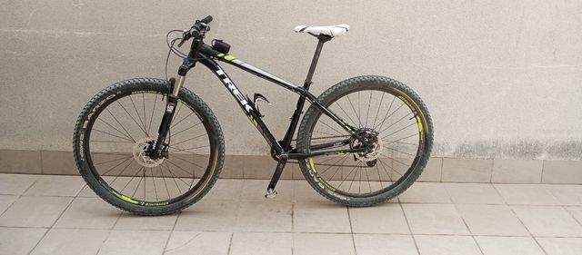 Detalles del productoBicicleta de montaña Trek en color negro con detalles en verde y blanco. Ideal para senderos y caminos.