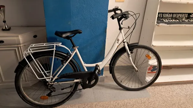 Detalles del productoBicicleta urbana de color blanco, ideal para desplazamientos diarios.