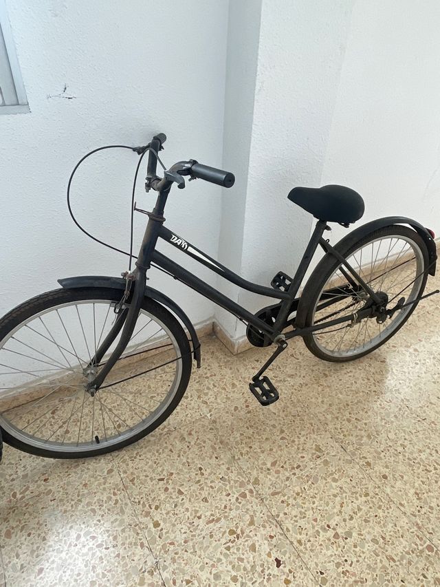 Bicicleta urbana de color negro, ideal para desplazamientos diarios. - Cuadro de acero. - Ruedas de 24 pulgadas. - Sillín negro. - Guardabarros delantero y trasero.
