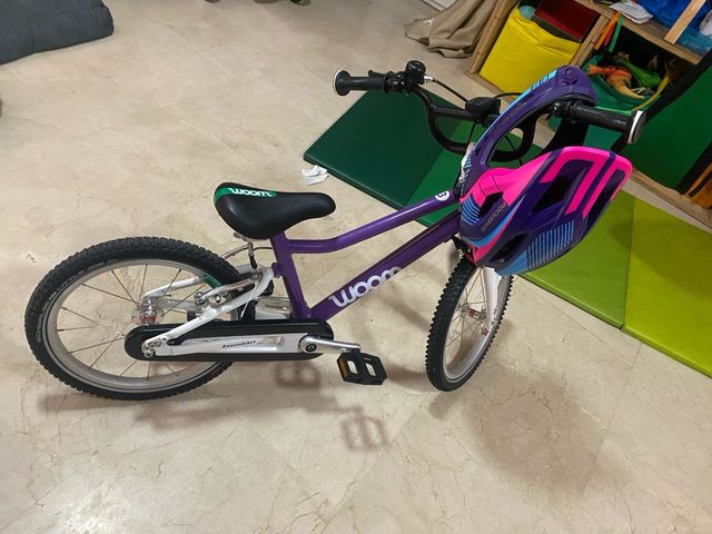 Detalles del productoBicicleta infantil Woom 3 en color morado. Diseñada para los más pequeños, es ligera y fácil de manejar.