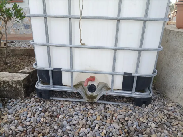 Bidón de agua IBC de 1000 litros, limpio y listo para su uso. - Estructura metálica. - Material del bidón: plástico blanco.