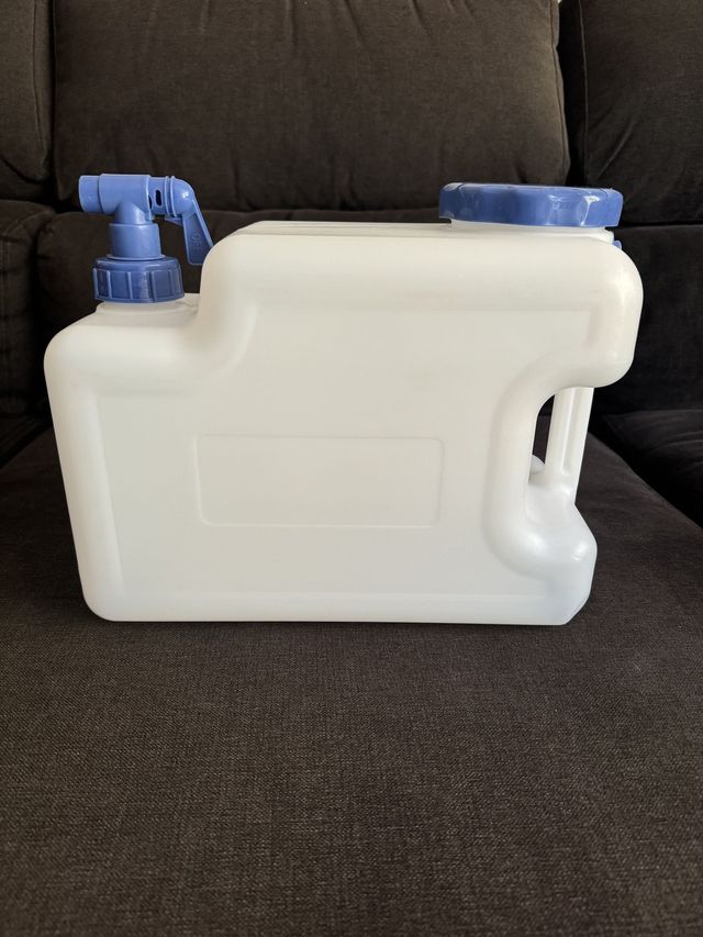 Detalles del productoBidón de agua blanco con grifo azul y tapa a juego. Ideal para almacenar y dispensar agua.