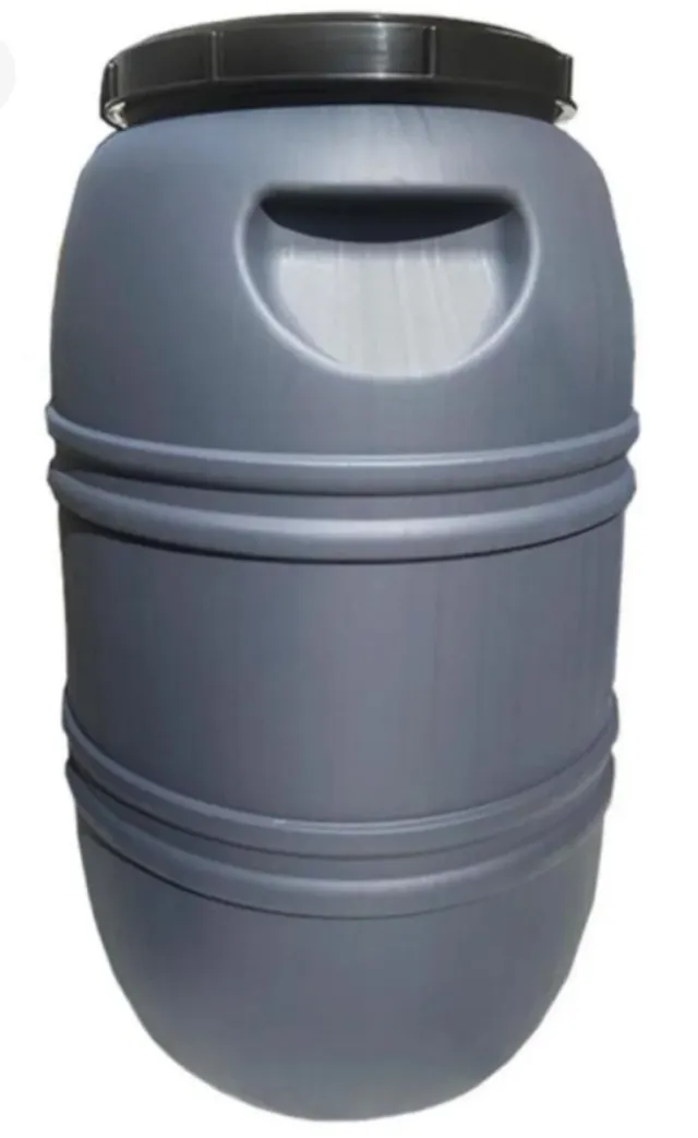 Bidón de plástico de 200 litros con tapa hermética. - Color gris oscuro. - Diseño cilíndrico con asas integradas. - Dos bandas de refuerzo en el cuerpo.