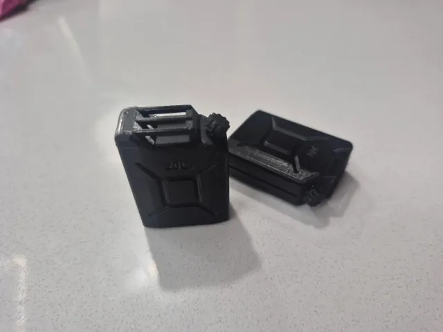 Set de dos bidones o garrafas de gasolina en miniatura, perfectos para maquetas y proyectos de modelismo.