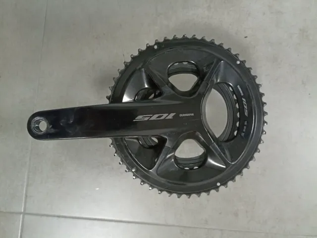 Juego de bielas Shimano 105 R7100 en color negro. - Longitud de biela: 175mm - Plato: 52-36T -6000 kms Se podrian vender sin platos por 45 euros