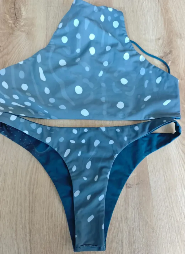 Bikini reversible con estampado de ballenas y lunares. Cuello halter, espalda cruzada en buen estado. Marca swit swim realizado con ECONYL nailon regenerado 100%. Se obtiene de residuos rescatados; como redes, plásticos, etc. Talla L. Muy nuevo.