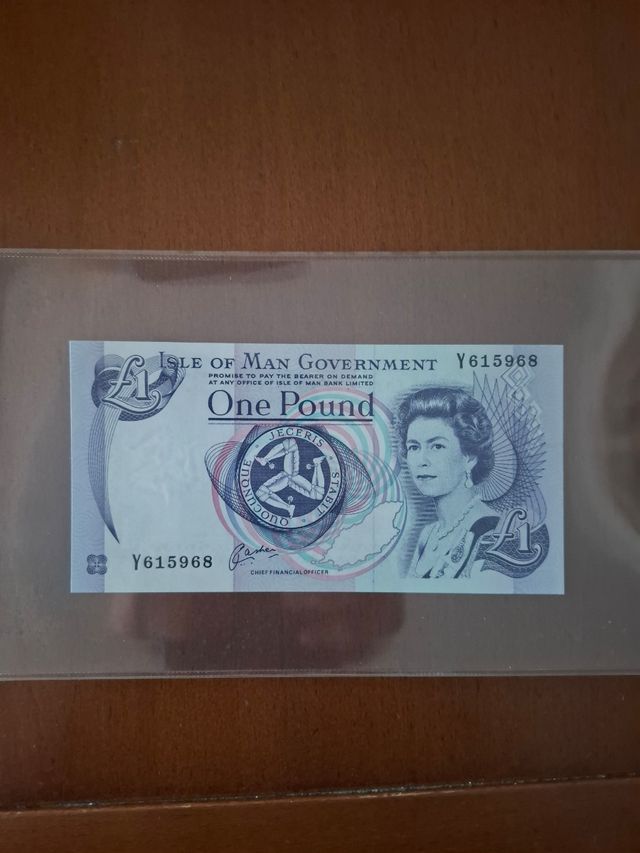 Detalles del productoBillete de una libra de la Isla de Man con el número de serie Y615968.