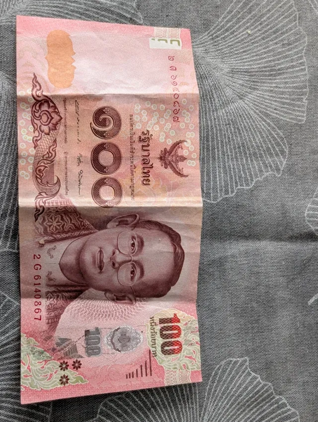 Billete de 100 bath de Tailandia. El billete muestra el retrato del rey. - Denominación: 100 bath. - País: Tailandia. - Serie: 2G 6140867.