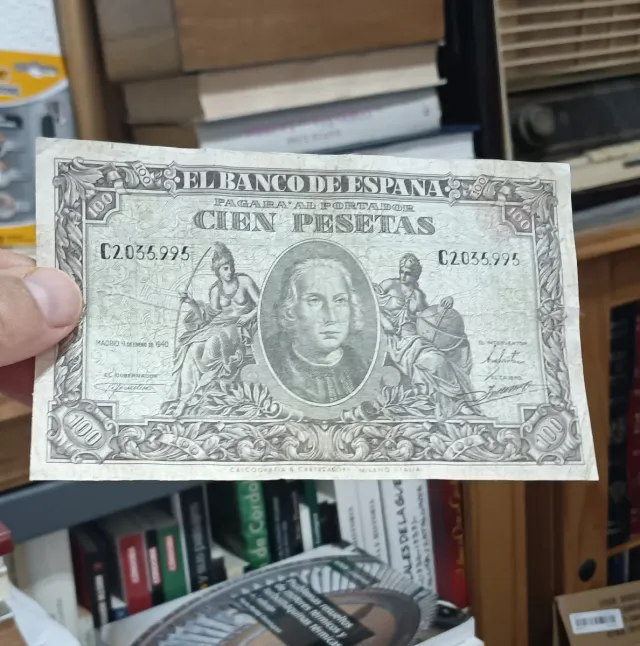 Detalles del productoBillete de 100 cien pesetas del Banco de España, emitido en 1940. Presenta un diseño detallado con figuras alegóricas y un retrato central de Cristóbal Colón.