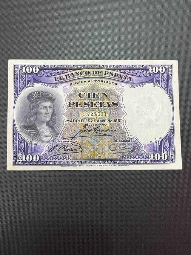Detalles del productoBillete de 100 pesetas del Banco de España, emitido en Madrid el 25 de abril de 1931.