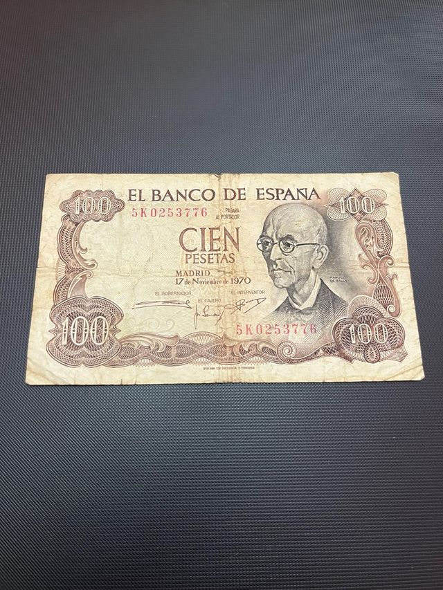 Detalles del productoBillete de 100 pesetas del Banco de España, emitido en 1970. El retrato en el billete es de Manuel de Falla.