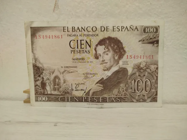 Detalles del productoBillete de 100 pesetas del Banco de España con fecha de 19 de noviembre de 1965. Presenta el retrato de Gustavo Adolfo Bécquer.