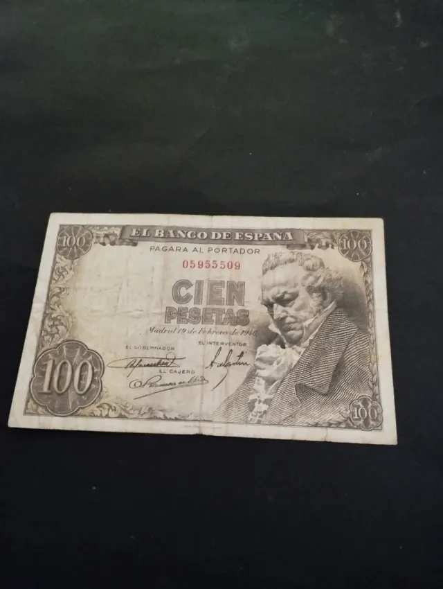Detalles del productoBillete antiguo español de 100 pesetas del Banco de España, con fecha de 19 de febrero de 1946.