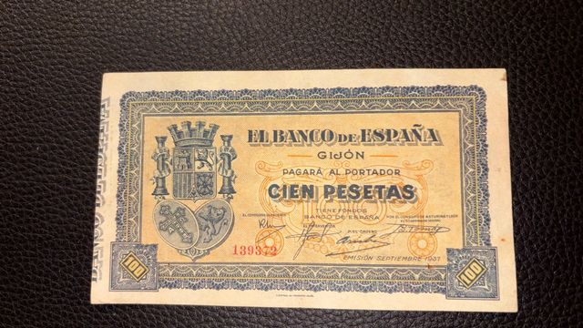 Billete de 100 pesetas emitido por el Banco de España en Gijón en septiembre de 1937.