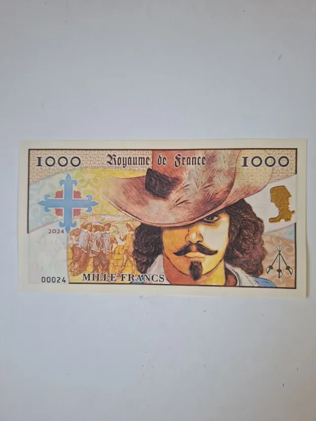Detalles del productoBillete de Coleccion de 1000 Francos del Reino de Francia, dedicado a los famosos 3 Mosqueteros. HOLOGRAMA DORADO CON LA FAMOSA BOTA DE LOS MOSQUETEROS QUE NO DISTINGUIA ENTRE EL PIE DERECHO Y EL IZQUIERDO.