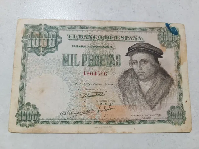 Detalles del productoBillete de 1000 pesetas del Banco de España, emitido en Madrid el 19 de febrero de 1946. Presenta un retrato de Joannes Ludovicus Vives.