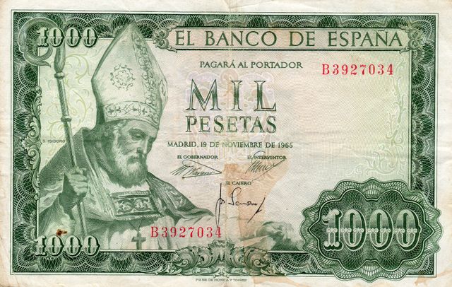 Billete de 1000 pesetas de 1965. - Número de serie: B3927034. -Con señales de uso pero bien conservado.