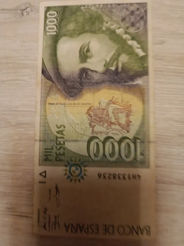 Billete español de 1000 pesetas con fecha de emisión 12 de octubre de 1992. - Denominación: 1000 pesetas. - País: España. - Año de emisión: 1992.