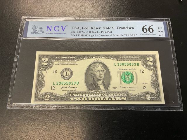 Detalles del productoBillete de 2 dólares de Estados Unidos, serie 2017A, con número de serie L33855833B. Este billete es conocido como Radar por su número de serie capicua, rarísimo, certificado plancha sin circular y con excelente calidad de papel. Muy raro