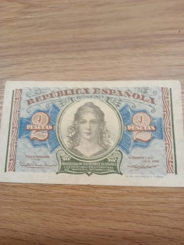 Detalles del productoBillete de 2 pesetas de la República Española, emitido en 1938.