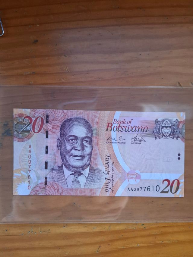 Billete de 20 Pula del Banco de Botswana. 2002 - Serie AA0977610. - Diseño con retrato y escudo nacional.
