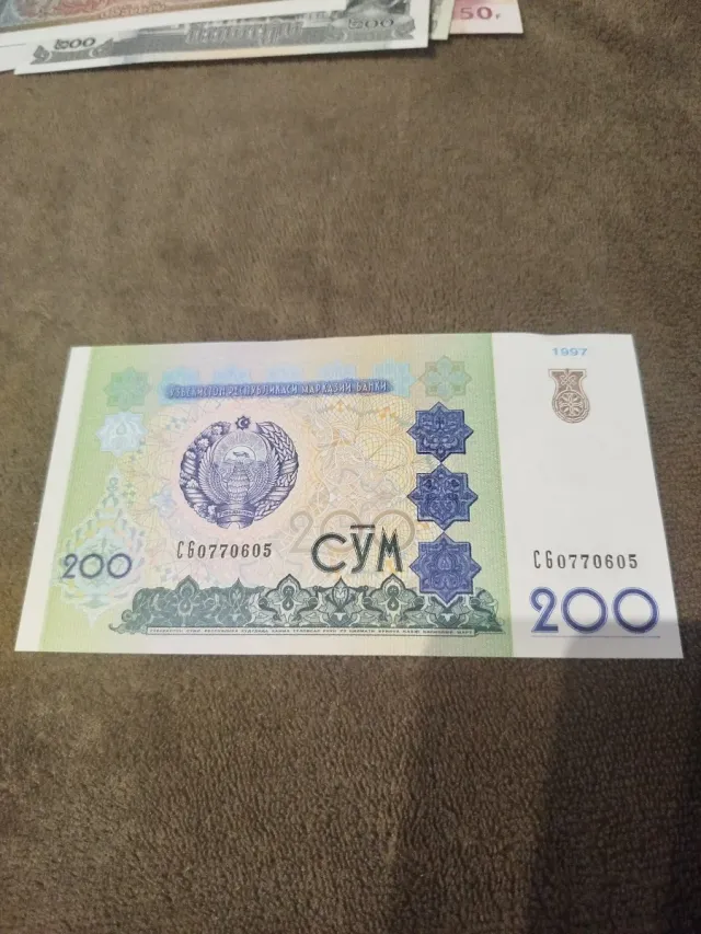 Billete de 200 S'om de Uzbekistán, emitido en 1997. - Diseño con el escudo de Uzbekistán. - Inscripción O'ZBEKISTON RESPUBLIKASI MARKAZIY BANKI.