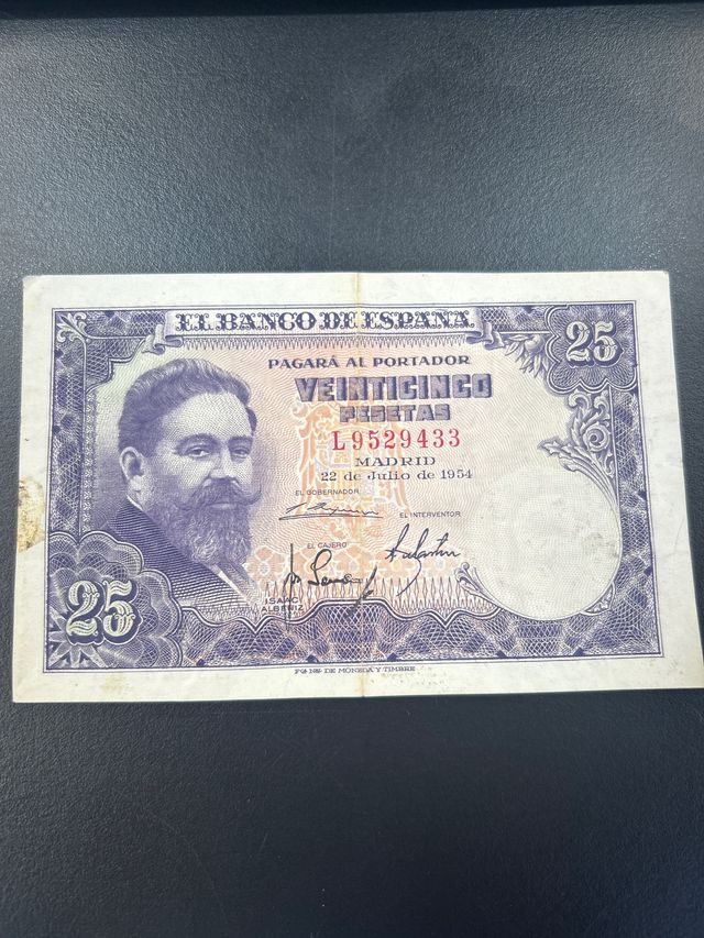 Detalles del productoBillete de 25 pesetas españolas del año 1954. Serie L. El billete muestra un retrato de Isaac Albéniz. Se encuentra en buen estado de conservación, aunque presenta señales normales de uso para su antigüedad. - Billete de colección. - Emisión del Banco de España. - Número de serie L9529433.