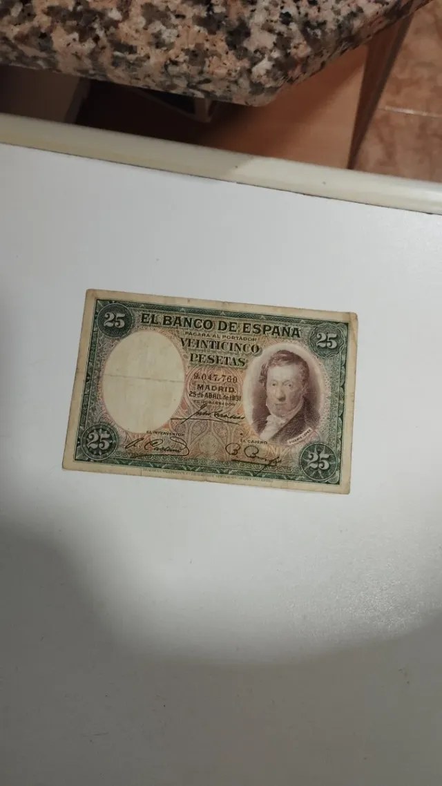 Detalles del productoBillete de 25 pesetas del Banco de España, emitido en Madrid el 25 de abril de 1931.