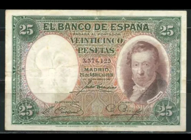 Detalles del productoBillete de 25 pesetas del Banco de España, emitido en Madrid el 25 de abril de 1931.sin serie