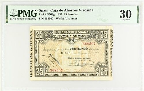 Detalles del productoBillete de 25 pesetas de España, emitido en Bilbao en 1937. Certificado por PMG con una calificación de 30 (Very Fine).