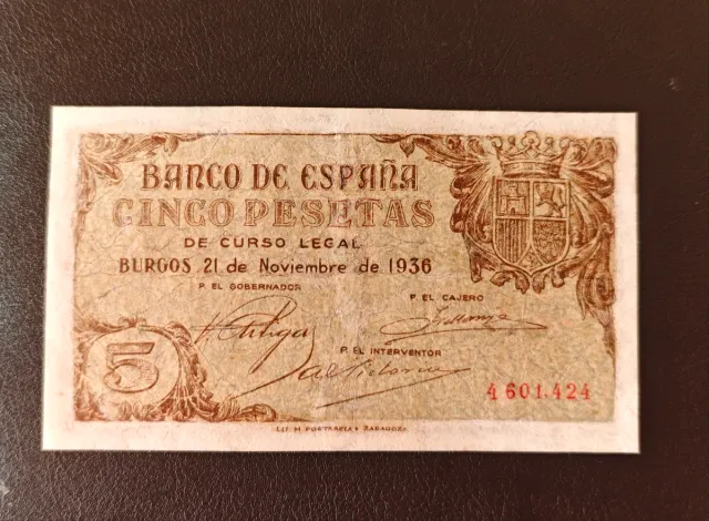 Detalles del productoBillete de 5 pesetas del Banco de España, emitido en Burgos en 1936.