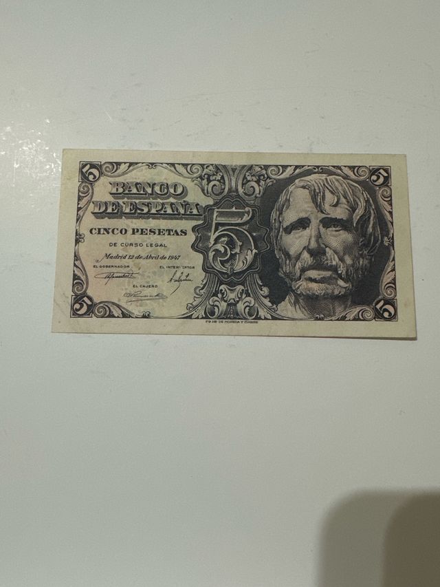 Detalles del productoBillete de 5 pesetas del Banco de España con fecha de emisión del 12 de abril de 1947.