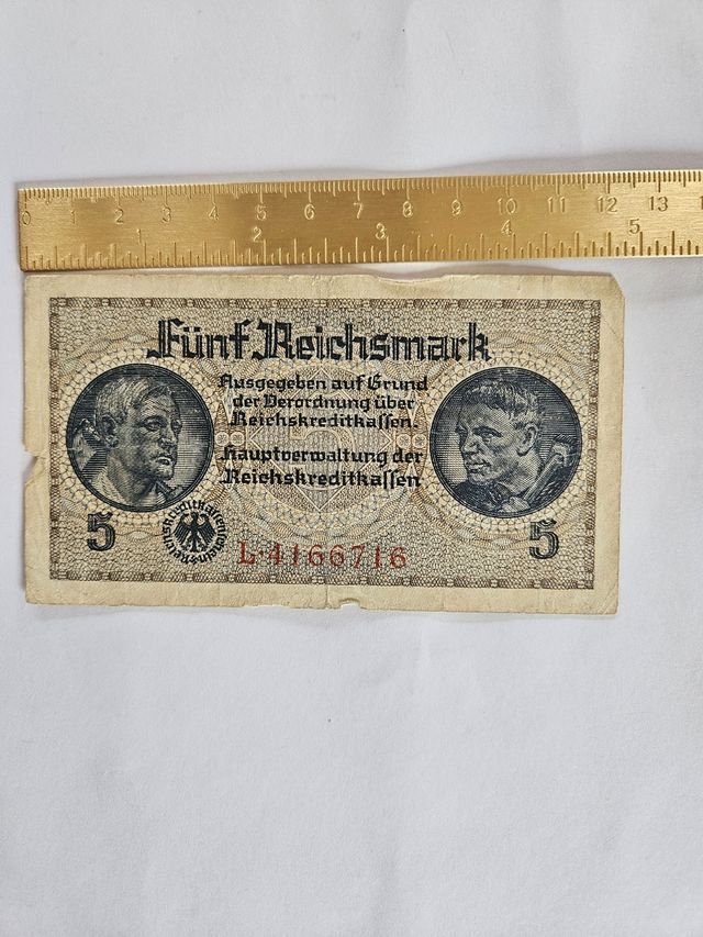Detalles del productoBillete 5 Reichsmark Alemania Tercer Reich original Billete histórico de 5 Reichsmark de Alemania (época del Tercer Reich). Conserva sus detalles originales con numeración visible y diseño clásico con retratos en anverso y el Partenón en reverso. Documento con valor histórico y de colección, ideal para coleccionistas de billetes antiguos y numismática alemana. Buen estado general, con señales de uso propias de su antigüedad.
