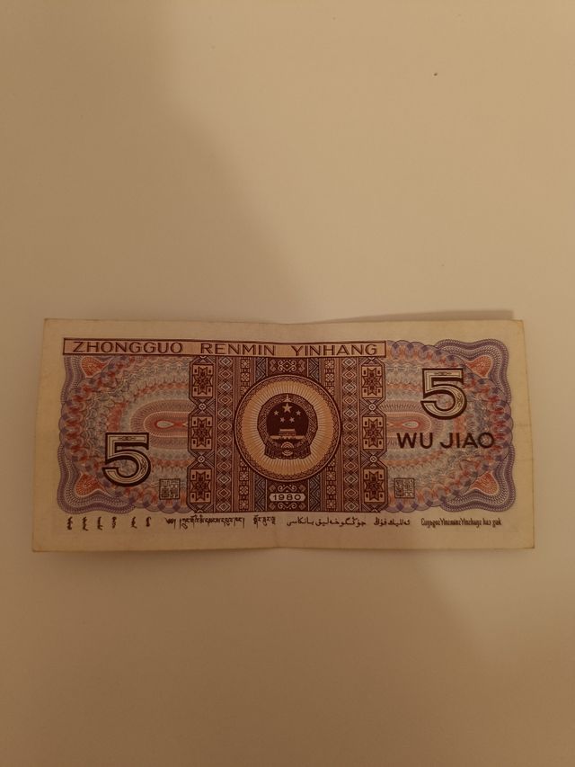 Billete de 5 Wu Jiao de China de 1980. Es un billete antiguo y se encuentra en buen estado de conservación.