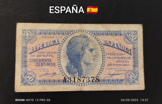 Detalles del productoBillete de 50 céntimos de la República Española, emisión de 1957. Un certificado provisional de moneda divisionaria.