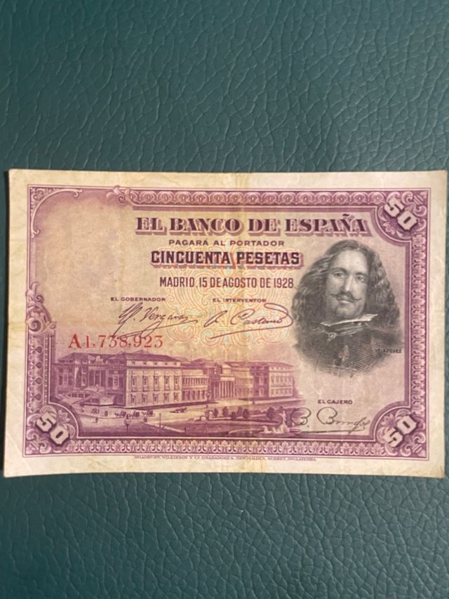 Billete de 50 pesetas del Banco de España con fecha de Madrid, 15 de agosto de 1928. - Serie A1. - Número de serie: 738.923.