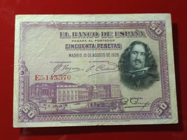 Detalles del productoBillete original de 50 pesetas, emitido en Madrid el 15 de agosto de 1928 por el Banco de España. Muestra el retrato de Diego Velázquez, uno de los grandes maestros del Siglo de Oro, y en el reverso una escena de su obra.