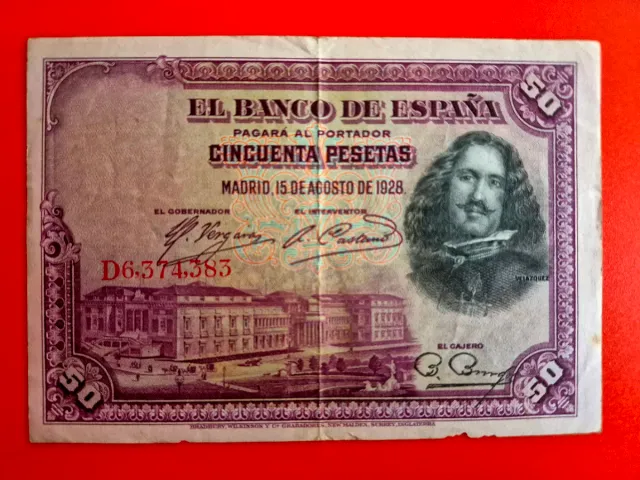 *Billete de 50 pesetas del Banco de España, emitido en 1928. *Billete circulado sin manchas ni arrugas, salvo el pliegue longitudinal. *Nº de serie: D6374383