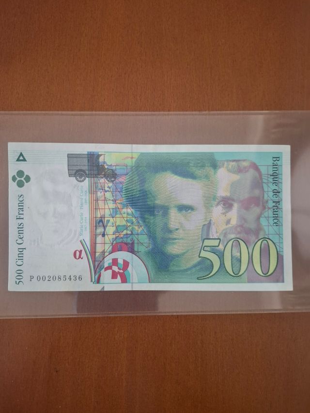 Billete de 500 francos franceses. Año 1994. Sin circular. - Presenta retratos de Marie Curie y Pierre Curie. - Incluye el texto Banque de France.