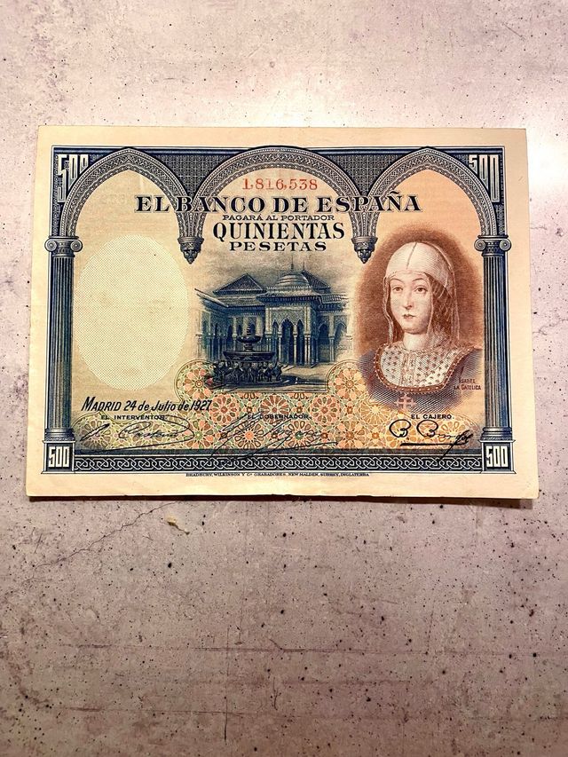 Detalles del productoBillete de 500 pesetas del Banco de España, emitido el 24 de julio de 1927. Presenta un retrato de Isabel la Católica.