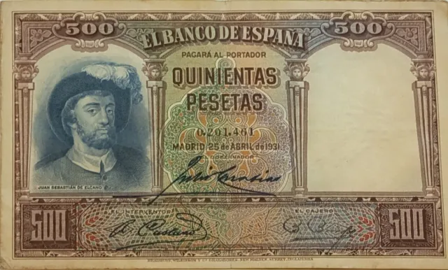 Detalles del productoBillete de 500 pesetas del Banco de España, emitido en Madrid el 25 de abril de 1931. Presenta un retrato de Juan Sebastián de Elcano. Con señales de uso y doblez central.