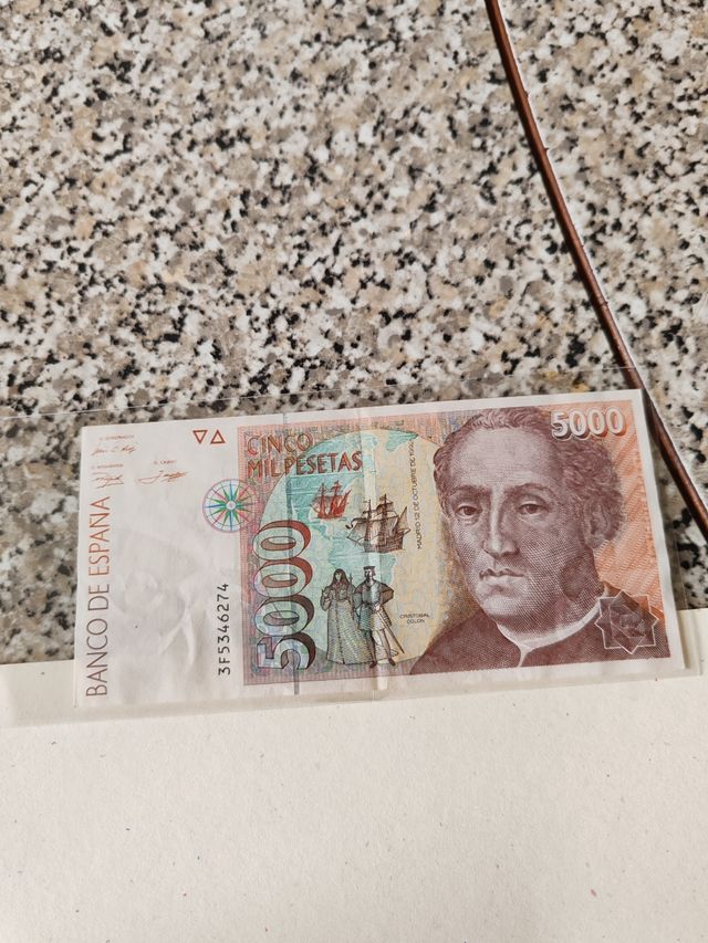 Billete de 5000 pesetas del Banco de España. - Serie 3F5346274. - Fecha de emisión: 12 de octubre de 1992. - Motivo: Cristóbal Colón.