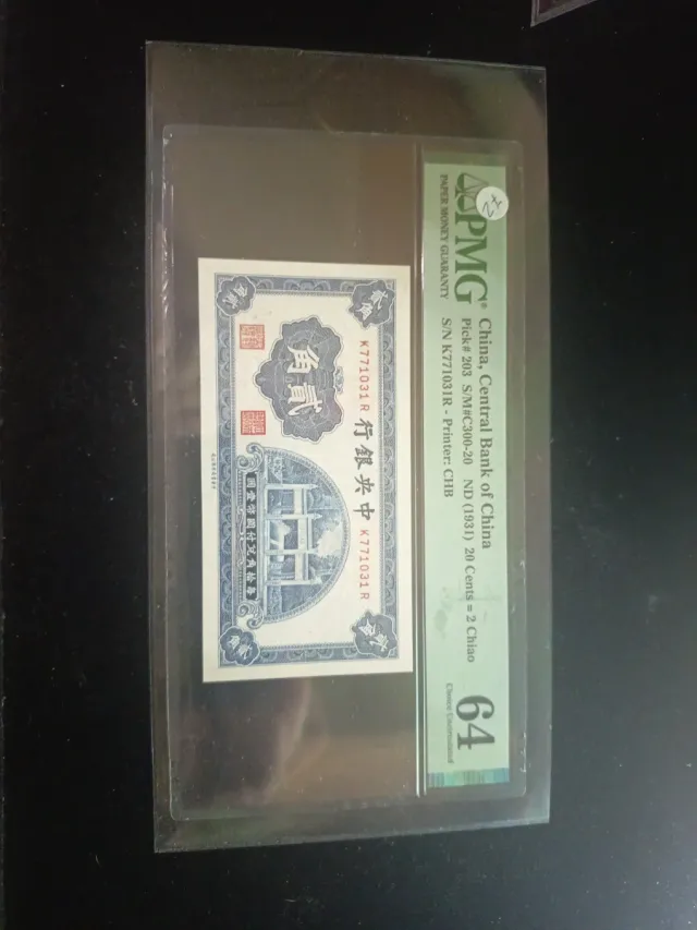 Detalles del productoBillete de 2 Chiao del Banco Central de China, emitido en 1931. Certificado por PMG con una calificación de 64.
