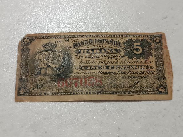 Detalles del productoBillete muy escaso. Colonia española de Cuba. Banco Español de la Habana. 1.872. Fecha muy rara (la más común es 1.876). Resello en reverso.
