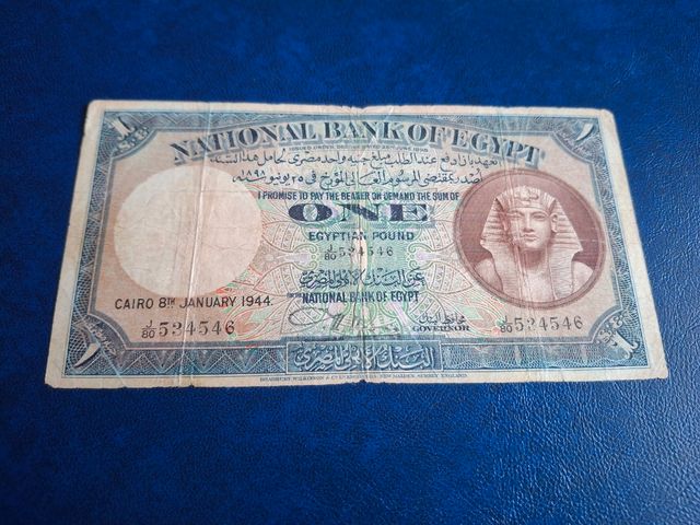 Billete de 1 Libra Egipcia emitido por el National Bank of Egypt en El Cairo. - Fecha: 8 de enero de 1944. - Diseño con retrato de faraón. - Texto en árabe e inglés.