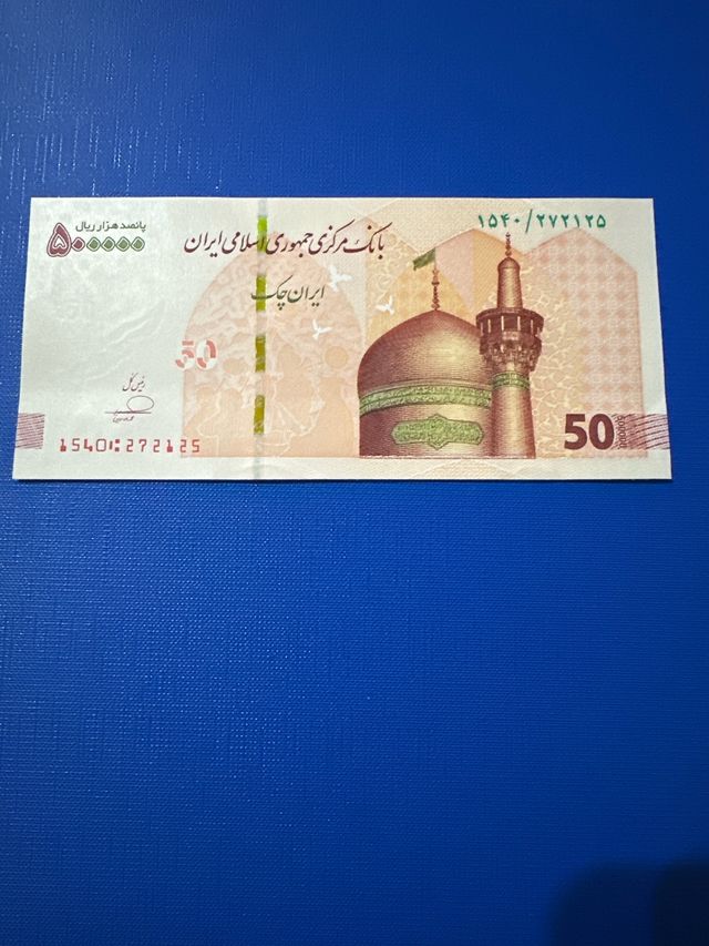 Detalles del productoBillete de Irán con valor de 50 riales. Presenta un diseño con arquitectura.